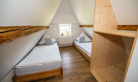 Die neue Ferienwohnung entstand 2022 durch Instandsetzung der Räume im Dachgeschoss. Das Ergebnis ist ein attraktives Appartment mit 95 qm Größe, welches durch einen eigenen Flur in der 1. Etage betreten wird. Von dort erreicht man das Dachgeschoss, indem ein großzügiger und offener Wohnbereich (nach Norden) und die Küche mit hochwertiger Einbauküche und Speisebereich (nach Süden) aufwartet. Ergänzt durch zwei Schlafbereiche (1 x Doppelbett nach Westen; 2 Einzelbetten sowie Aufbettung nach Osten), sowie das Badezimmer. Bis in die Dachspitze durchdacht unser herrliches Urlaubs- oder eben Himmelreich!
