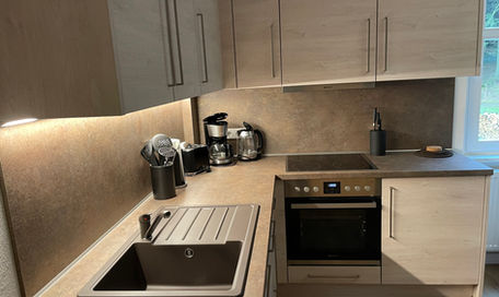 Die Küchenausstattungen umfassen Herd mit Backofen, Mikrowelle, Geschirrspüler, Kühlschrank, Wasserkocher und Toaster. Flat Screen TV, Gäste – Wlan, Bücher, Spiele und Informationsmaterial sind selbstverständlich stehen kostenfrei zur Verfügung, wie auch ein Parkplatz auf dem Gelände.